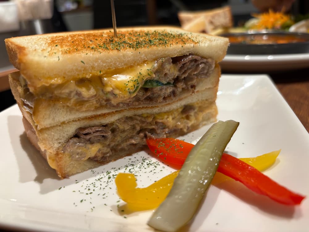 炒めた薄切り肉ととろけるチーズをパンで挟んだ、ボリュームたっぷりの一品です。