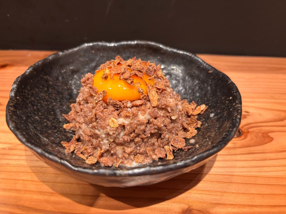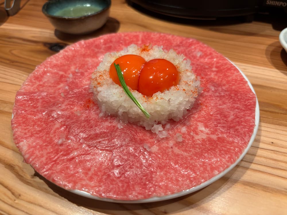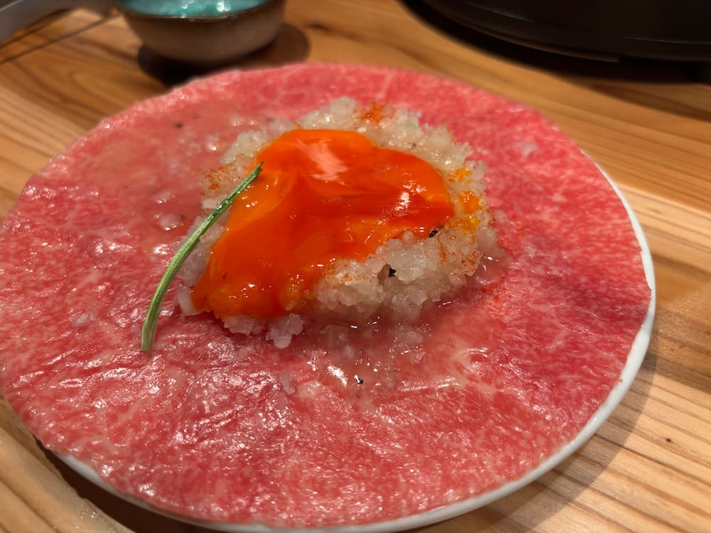 黄身をそっとつぶして、お肉に絡めて、いざひと口。
