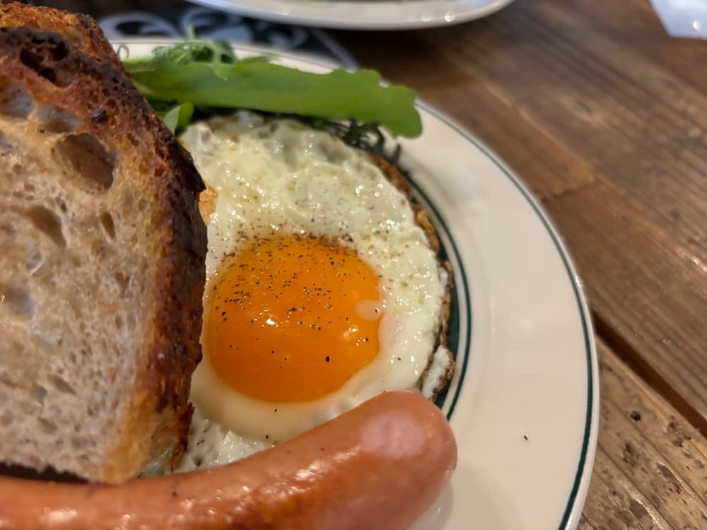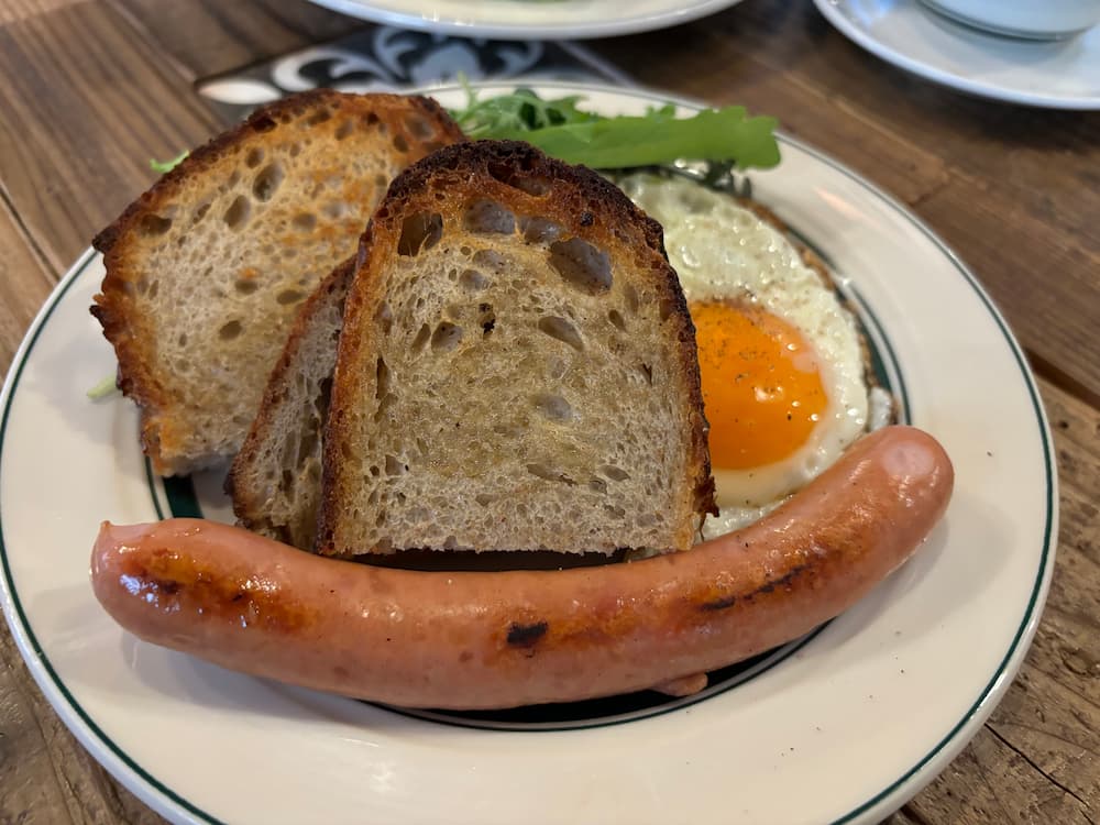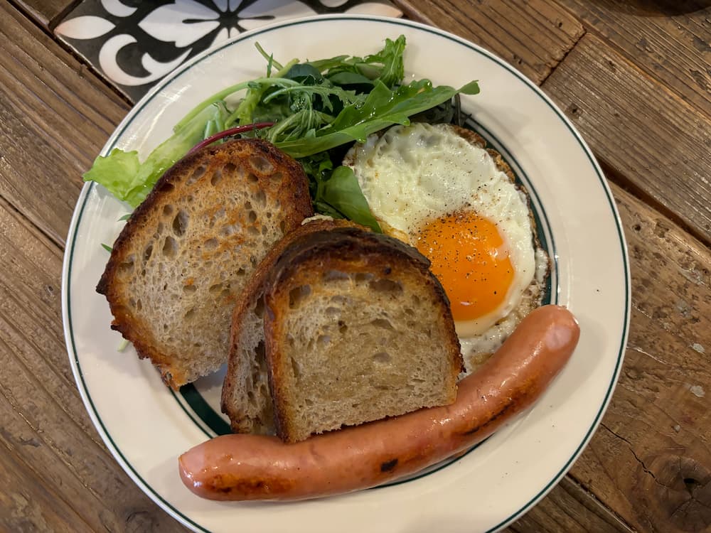 自家製カンパーニュがハーフで3枚、ソーセージ、目玉焼き、サラダが乗っています。