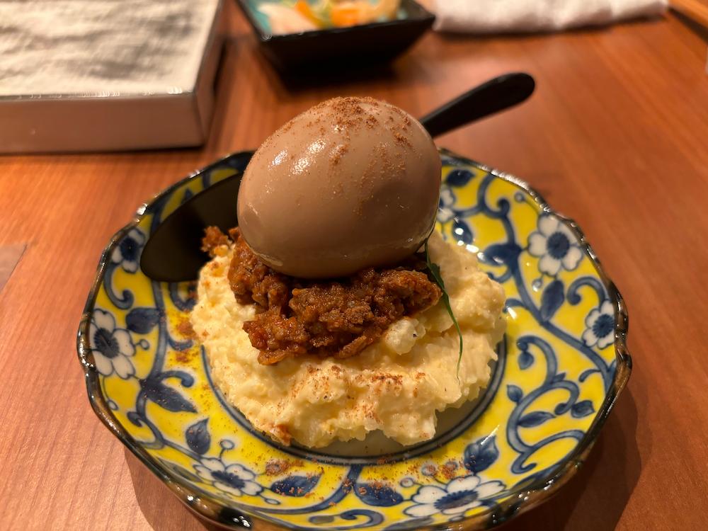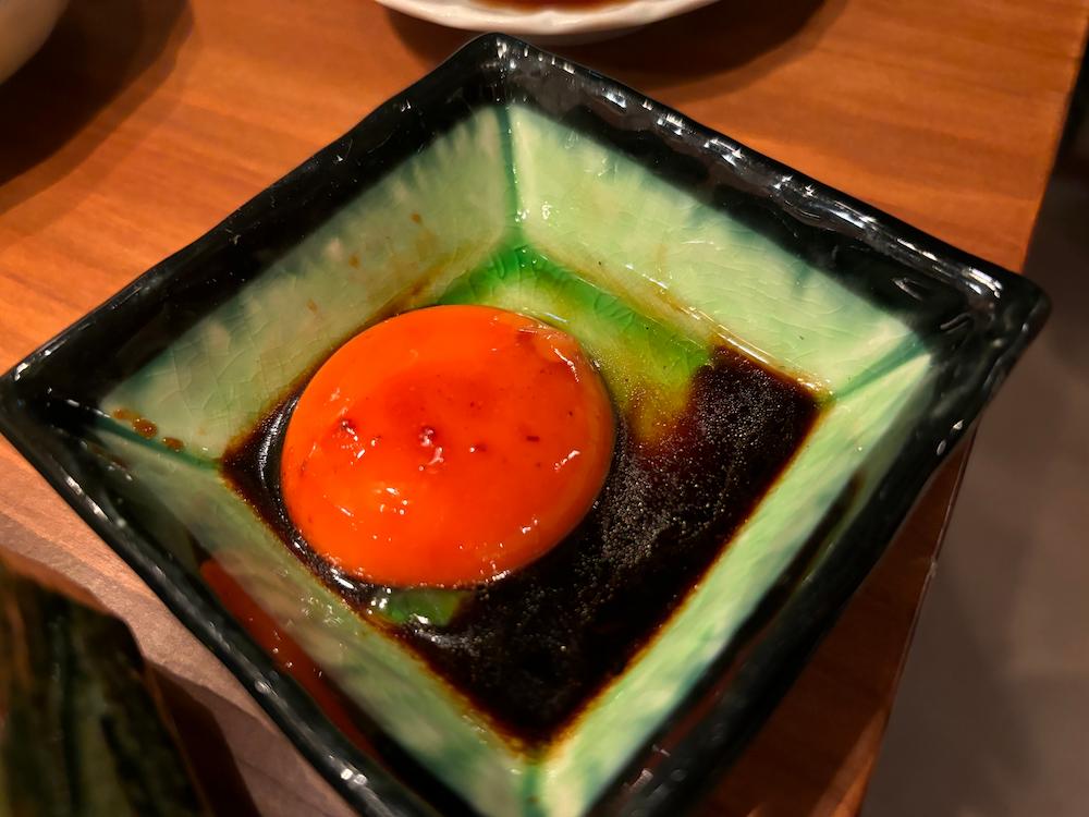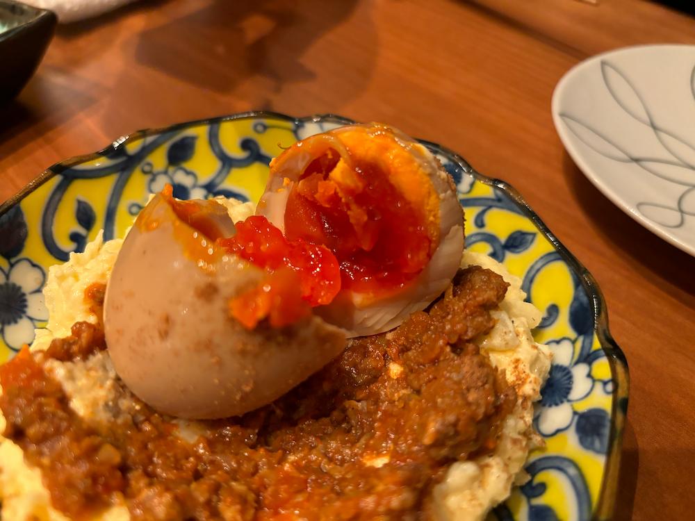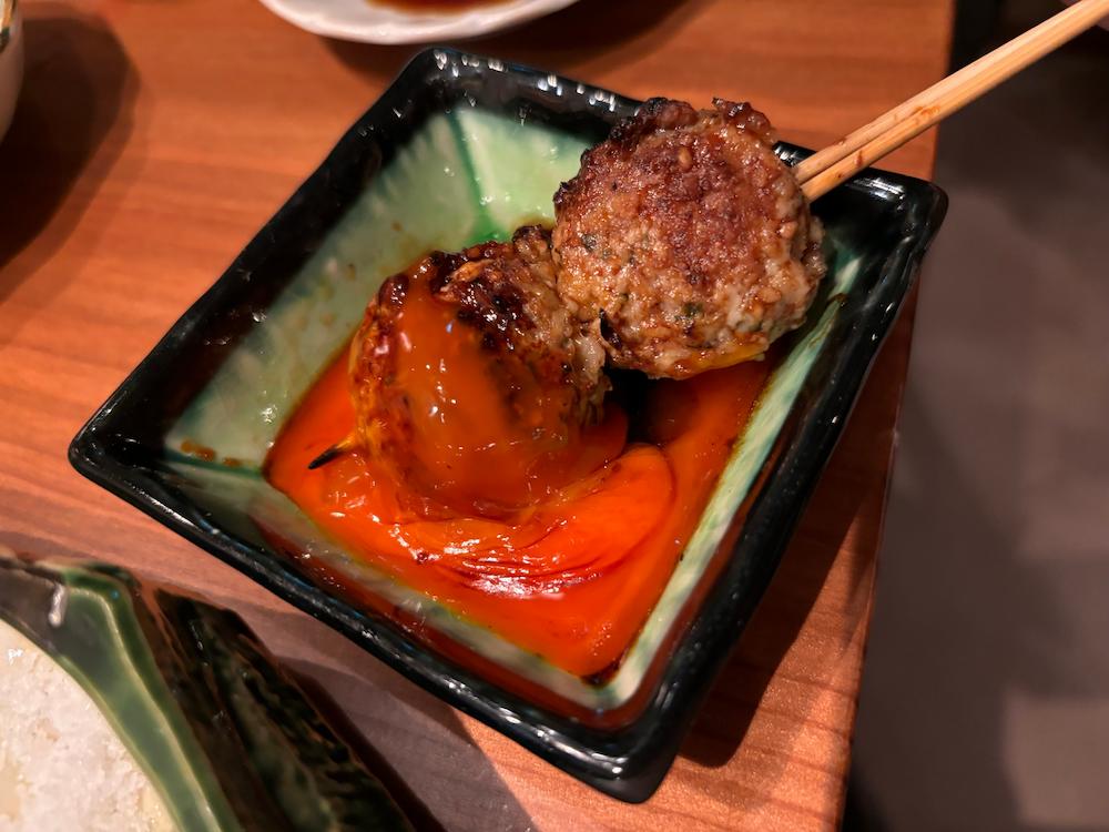 醤油漬けで通常の黄身より少し固くなっているので、つくねによーーーく絡みます。
