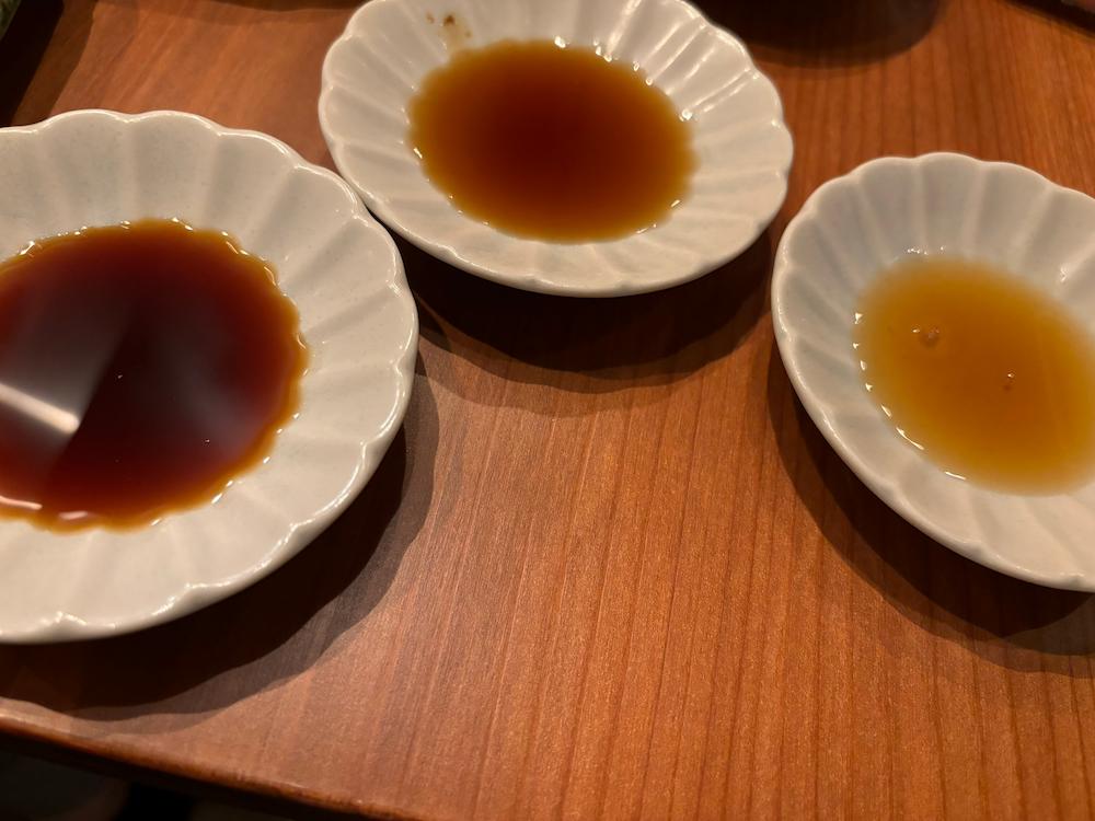 お好みでにんにく、生姜、ワサビ、お塩をつけて。タレは醤油、ポン酢、胡麻油の3種類です。