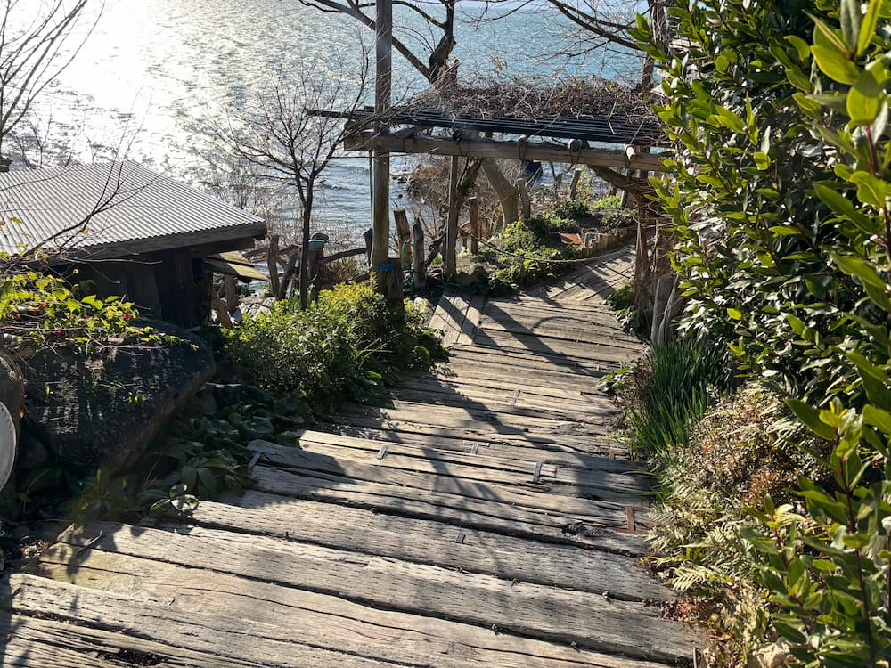 テラスから見えた鳥が気になってお店の周りをキョロキョロしていたら、お店の向かって左側に階段を発見。