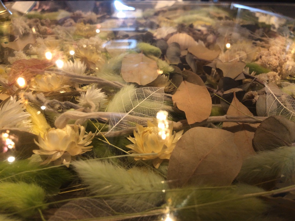 ガラスの天板の下にお花や葉っぱがこれでもかと入れられています。めちゃめちゃかわいいです。