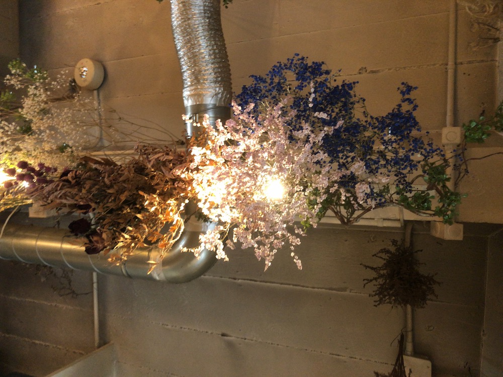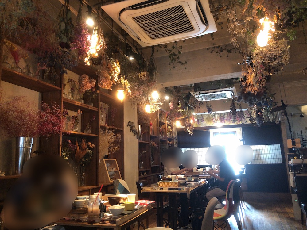 お昼はカフェ、夜は居酒屋として営業されていて、入口や店内にたくさん飾られているドライフラワーが特徴。